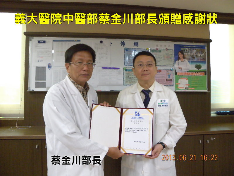 義大醫院中醫部蔡金川部長頒贈感謝狀給陳潮宗醫師