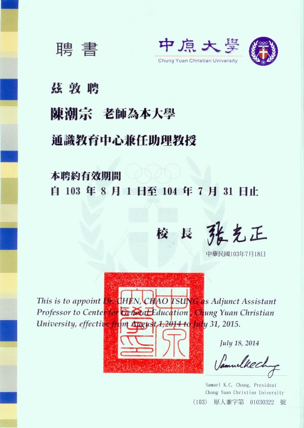 陳潮宗院長應聘為中原大學103年學年度助理教授!!!