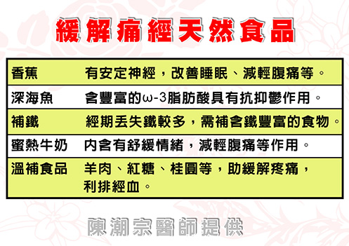 痛經的藥膳調理 1.桃仁粳米粥 材料:桃仁10~15克粳米75克。 作法:先把桃仁搗爛如泥 , 加水研汁去渣 , 同粳米煮為稀粥。 功效:活血通經 , 祛瘀止痛。適用於婦女瘀血停滯而引起的痛經。 2.薑棗紅糖湯 材料:乾薑、大棗、紅糖各30 克。 作法:將大棗去核洗淨、乾薑洗淨切片,加紅糖同煎湯服。 功效:補脾胃,溫中益氣。適用於寒濕凝滯型,氣血虛寒痛經。 3.補益烏雞湯 材料:雄烏骨雞500克,陳皮3克,良薑3克,胡椒6克,草果2枚,蔥醋適量。 作法:將雞切塊 , 與上述各味同煮 , 文火煮爛。 功效:溫中健胃 , 補益氣血。適用於婦女痛經之屬於氣血雙虧者。 緩解經痛穴位按摩 太衝穴:位置在腳大趾與第二趾之間。 血海穴:屈膝,在大腿內側,髕底內側端上2寸,當股四頭肌內側頭的隆起處。 功效:疏肝理氣,活血化瘀、理氣止痛。 方法:每個穴位按壓5秒鐘,重複10下,每天6回。 經期的保健 1.保持清潔:保持外陰部清潔,採用淋浴,定時換衛生棉。 2.避免寒涼:應避免受寒、經期勿洗冷水澡,洗完頭髮要吹乾。 3.避免過勞::如劇烈運動或提重物而使下腹部用力,易造成經血過多或延長。 4.飲食有節:經期間勿食辛熱、過鹹、寒涼、茶酒,勿過量或過飢。 5.調和情志:保持樂觀愉快的心情,使氣機和暢,自然會減少痛經的發生。 6.節育和節慾:經期不慎房事,易耗傷腎氣,又易招致外邪侵入引起痛經及感染。 |