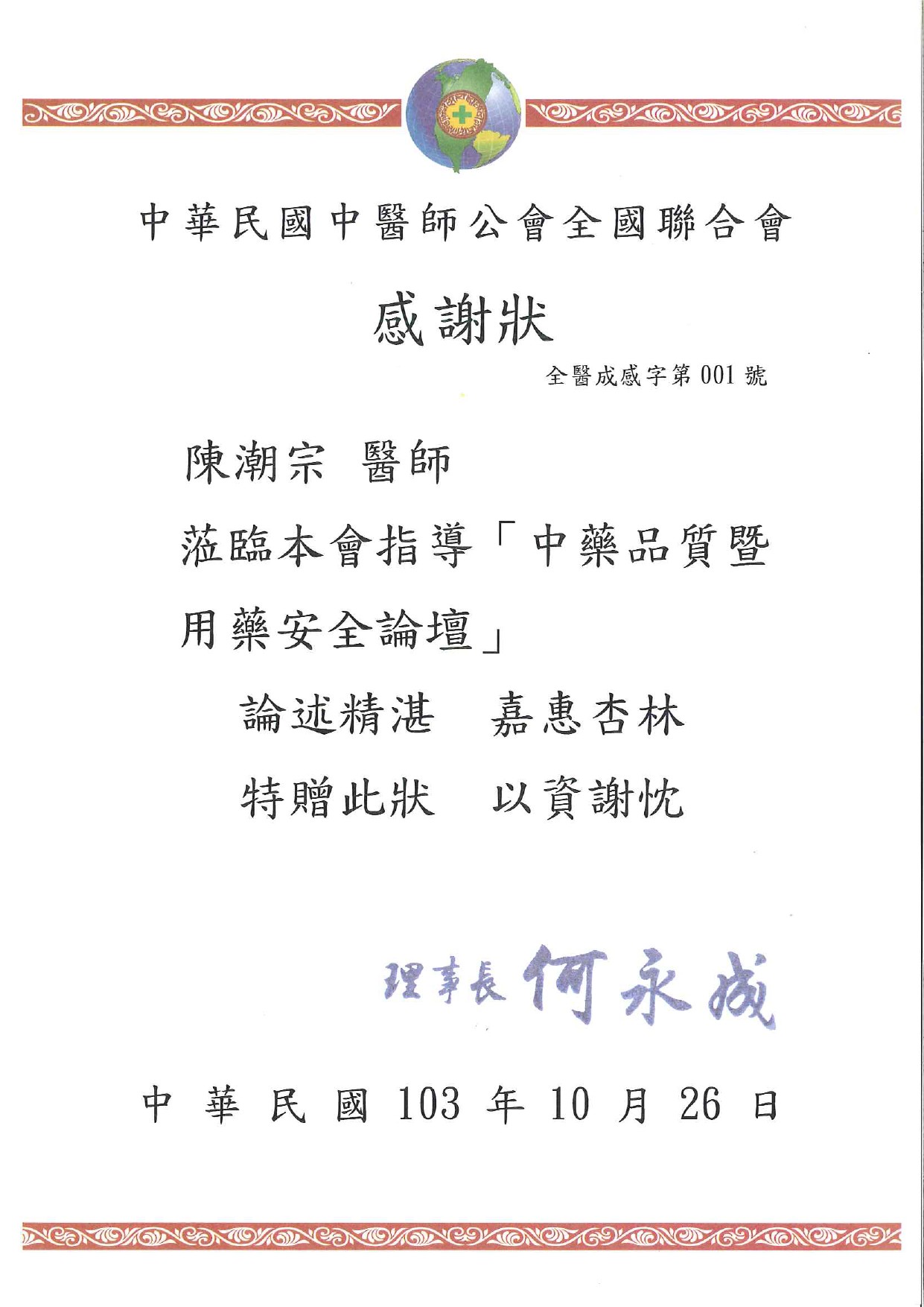 陳潮宗院長受邀參加「中藥品質暨用藥安全論壇」,公會特贈感謝狀。
