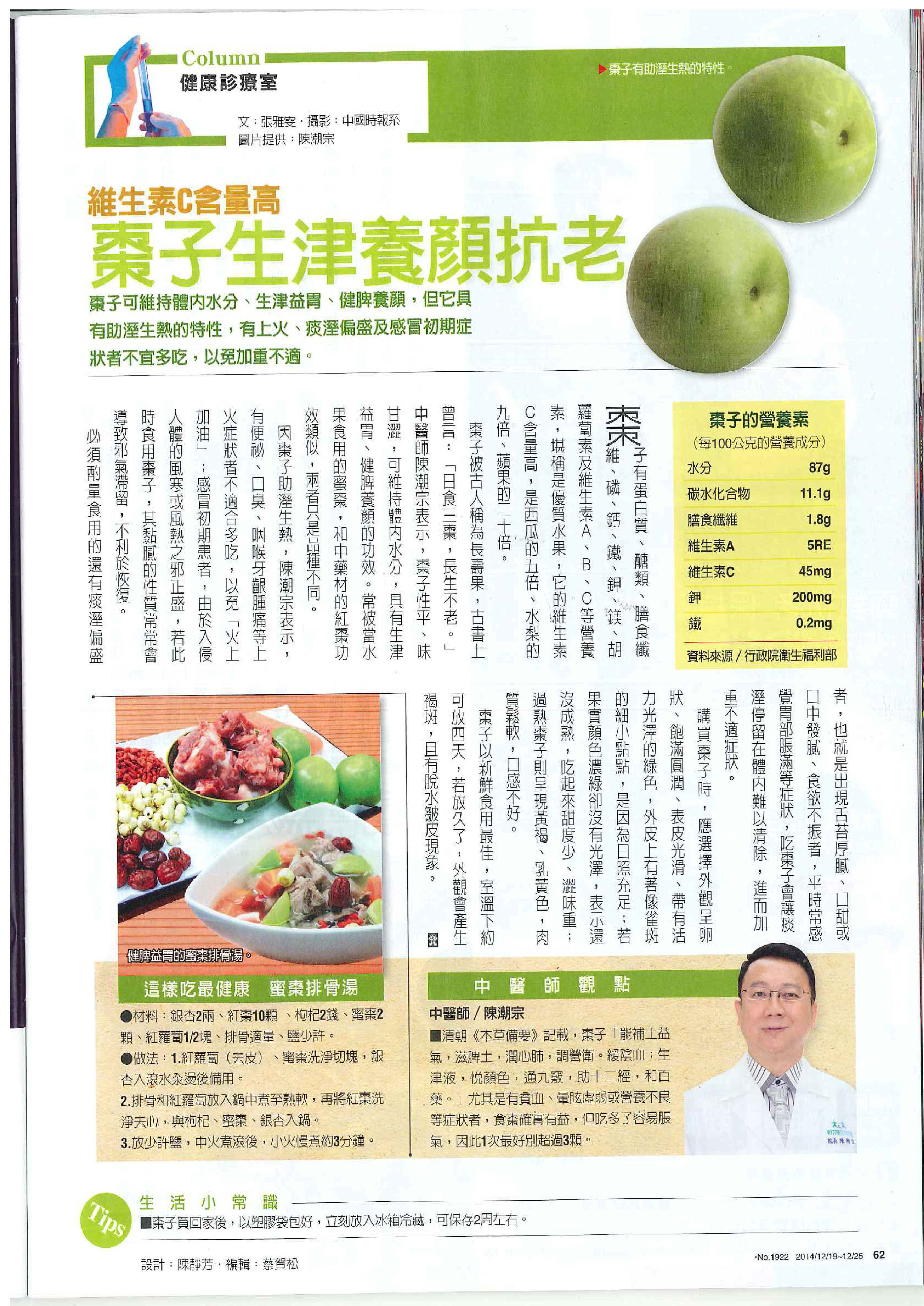 中醫師陳潮宗表示,棗子性平、味甘澀,可維持住體內水分,具有生津益胃、健脾養顏的功效。常被當水果食用的蜜棗,和中藥材的紅棗功效類似,兩者只是品種不同。
