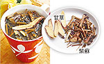 材料:紫蘇10克、甘草3克。 作法:將所有材料放入300c.c.水中大火煮滾後,再煮3分鐘即可。 作用:祛風散寒、化痰。 |