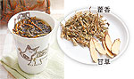 材料:藿香10克、甘草3克 作法:將所有材料放入300c.c.水中大火沸後,續煮3分鐘即可。 作用:芳香化濕、和胃止嘔。 |