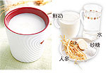 | 補氣人參奶 | 材料:新鮮人參50克、鮮奶250c.c.、水500c.c.、砂糖適量。 作法:將新鮮人參洗淨、切片,放入果汁機。加入250c.c.水和適量砂糖,打成人參糖漿。再將人參糖漿倒入過濾袋,濾汁備用。將濾出的汁加入鮮奶與水各250c.c.,放入果汁機或食物處理機打1分鐘即完成。 作用:清潤提神,人參味道濃郁,能大補元氣、壯陽益腎、開胃生津、益智、改善虛弱體質。牛奶有豐富的蛋白質,能增強人體抵抗力。 注意:感冒症狀仍持續者不適合喝人參牛奶。 |