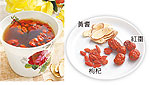 | 黃耆枸杞紅棗湯 | 材料:黃耆20克、枸杞15克、紅棗15克。 作法:所有藥材放入鍋中,加入500c.c.水大火煮滾即可 作用:黃耆補氣、補虛;枸杞補陽、調節免疫功能;紅棗可補氣健脾,對細胞損傷有修復作用。 |