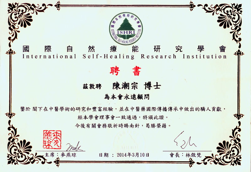 香港中醫師團體國際自然療能研究學會永久顧問。