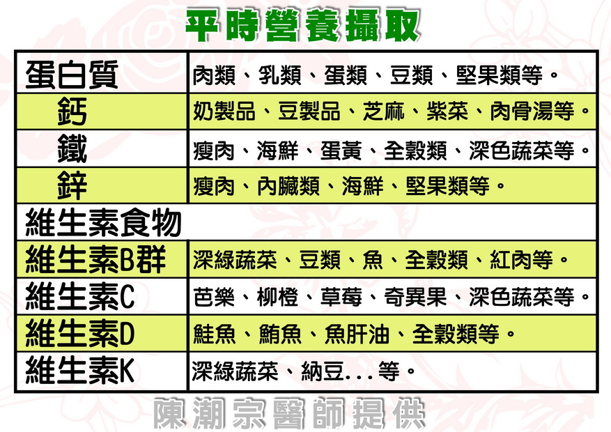 5.維生素食物 (1)維生素B群:深綠蔬菜、豆類、肝臟、魚、全穀類、紅肉、牛奶、乳酪。 (2)維生素C:芭樂、柑橘、柳橙、草莓、奇異果、深綠、深黃、深紅蔬菜類等。 (3)維生素D:鮭魚、鮪魚、魚肝油、動物肝臟、全穀類、蛋黃等。 (4)維生素K:深綠蔬菜、納豆,一般維生素K只要正常飲食便不致於缺乏。 生活注意事項: 1.營養均衡:在均衡飲食的前提下,建議孩子多攝取含鈣質、蛋白質的食物,可促進骨骼發育;此外,應避免攝取刺激性、高油脂的食物與零食,以免肥胖造成營養失衡,增加性早熟的風險 2.忌冰冷:一切動植物均在寒涼時動作生育緩慢,甚至需要冬眠,植物冬天無法發芽都是受寒冷的影響,人的發育也不例外,盡量避免冰涼飲品,以免影響發育。 3.減輕壓力,保持愉悅心情:心情愉快會影響生長激素的分泌,現代心理學研究,精神經常處於緊張或壓抑的狀態,如憂鬱、焦慮或急燥,會使大腦功能紊亂,導致生長激素、胰島素分泌失常,對生長極為不利。 4.適度運動:維持規律的運動習慣,可刺激長骨生長板活化,助益腿的發育,還能有助於舒壓。 5.睡眠充足:所謂「一瞑大一寸」,凌晨1點到2點是生長激素分泌最旺盛的時候,建議養成規律的作息,晚上11點前睡覺,每天睡滿8小時,可讓身體獲得充分休息,生長激素正常分泌,健康成長。 6. 適當的日照:可加速體內維生素D3的合成,改善血液中鈣、磷代謝,促進生長發育。 |