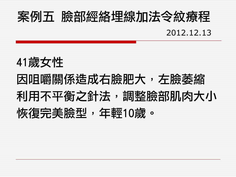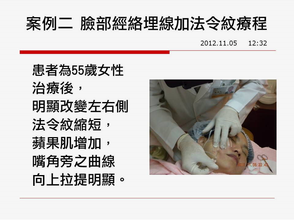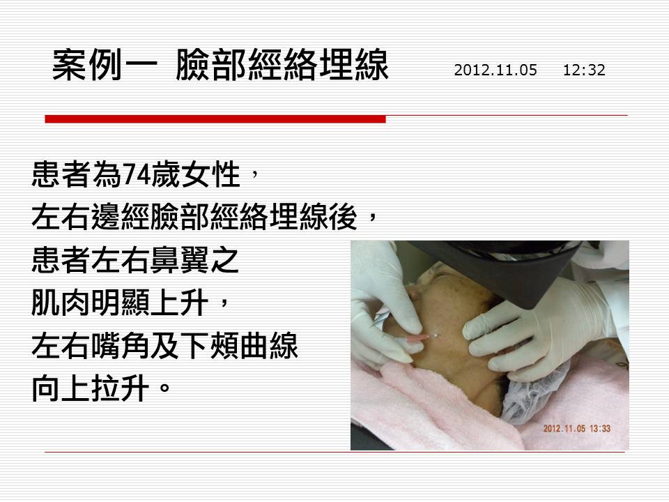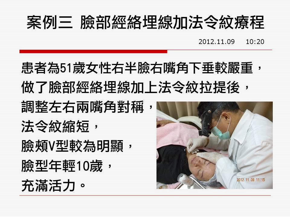 針對這個項目,我們已有豐富之經驗,這也是中醫醫美困難度最高的技術,目前在日韓、歐美及台灣西醫醫美領域爭相採用,亦大量採用此療程為病患治療。 優勢在在於施術操作簡單時間短、併發症少、立即見效。在台灣中醫界,本院陳潮宗院長更是這領域的教授。 這種針灸埋線療法利用特殊細長之注射針夾帶心臟手術專用之特殊耐久型羊腸線,以解決因年齡因素導致真皮層及皮下組織層之彈性纖維鬆弛,加上地心引力所致的下垂。 這種特殊羊腸線的效用主要是高張力,依文獻記載特殊耐久型羊腸線在體內可維持至少 200 天以上,甚至有人說可達 1 年之久。 換句話說,這樣的療程已是跨越原來針灸學的技術及新應用的新紀元,因為臉部有很多的血管及神經,施作的困難在於治療如何不痛、不出血及術後沒有副作用這牽涉到醫師的經驗值。 利用這種療法特色在於改善下垂的肌膚,這種調整非常自然而不做作,優於其他所謂之拉皮療法。 通常這樣的治療,施作後馬上可看到成果,實作前先照相評估如何施作及治療中完成一側我們會照相,可做半臉試驗比較,讓患者得到滿意的效果。 在我們的臨床操作中,亦可做到不平衡臉形的矯正作用如嘴歪調整。非常有意思的這種種針法,可謂是中醫及西醫醫美未來的新潮流。 這樣的治療通常從頭到尾 1 小時即可完成,醫師施術大約 30 分鐘,前後置時間預備大約 30 分鐘。除了消除國字臉即所謂瘦小臉臉部經絡埋線,即增加所謂的鼻翼兩旁之蘋果肌及法令紋拉提,矯正調整臉型之外,本療法亦可針對抬頭紋、眉間川字紋、眼後魚尾紋、口角外之木偶紋及顴頰下之淚溝作改善的作用。 一般做這樣的治療前,醫師會先拍照與患者討論施作的內容並溝通患者的需求。