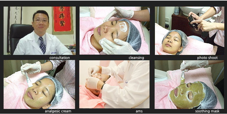 快速芒刺微針的過程 醫師諮詢 - 臉部清潔 - 術前照相 - 上鎮痛軟膏 - 快速芒刺微針- 上舒緩面膜 適應症: 黑斑、色素沉澱、 細紋、皮膚鬆弛、黑眼圈、輕度痘疤、玫瑰痤瘡