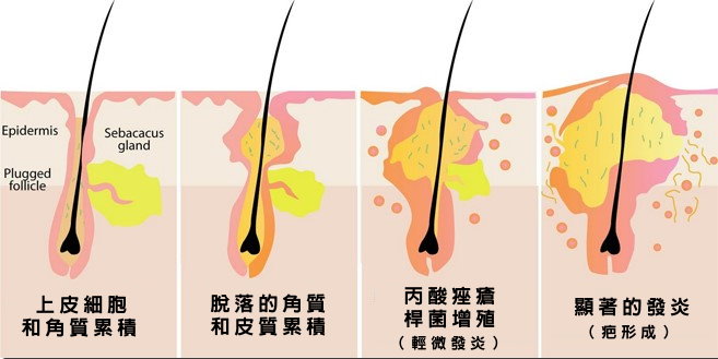 Epidermis- 表皮 Plugged follicle- 阻塞的毛孔 Sebaceous gland- 皮脂腺