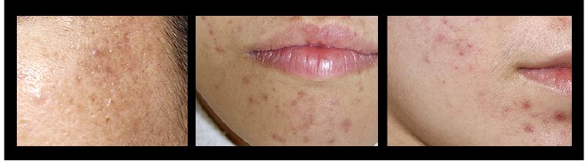 圓點型疤痕只發生在真皮層損傷時, 圓點型疤痕是由於痤瘡病變,破壞了真皮層膠原蛋白復原的正常形成過程,膠原蛋白沒有在 一個 正常的、平滑的、波浪形的表皮層形成,也沒有與肌膚表皮平行。 膠原蛋白反而永久的融合了皮下纖維厚束,致使肌膚表皮凹陷,其限制了血液在表皮流動,造成了老化及萎縮狀。