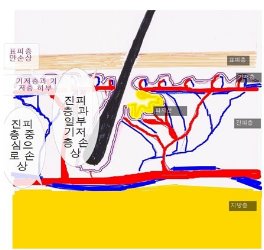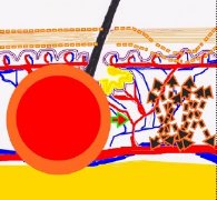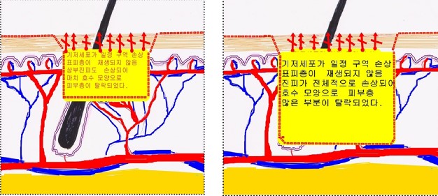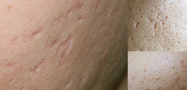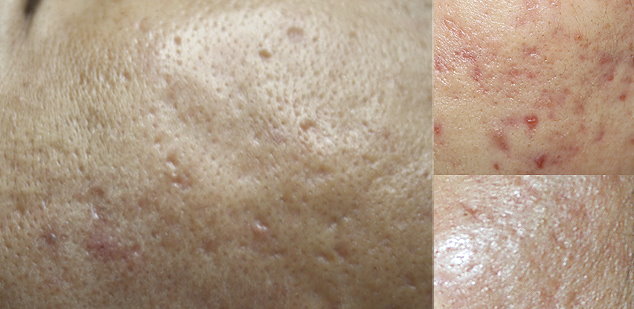 圖下: 痘疤是真皮內痤瘡發炎所引起。疤痕是因為傷口試著自我修復造成太多的膠原蛋白聚集於一點。 對於痘疤治療,目前沒有一種單一的或是理想的治療方法存在。痘疤有不同的形狀與大小。及早治療青春痘及控制病情是很重要的,如此才不會致使疤痕產生。在治療痘疤時,根據肌膚類型、痘疤型態而選擇正確的治療方法是最重要的因素。