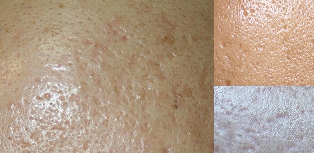 損傷於毛孔內及周圍 痤瘡活躍時其他類型的痘疤形成可能會使局部毛孔看起來粗大 當炎症消退,毛孔失去彈性,在毛孔的小痘疤會形成冰鑿性的疤痕。