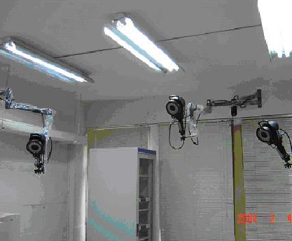 1 Institute of China Medical Science, ChineseMedicineUniversity 2 Institute of Biomedical Engineering, 附2實驗設備與器具在實驗設備部分,以紅外線動態立體攝影機與肌電圖儀為主,實驗器具方面有針灸針、電針機及電極片。 3.1.1 紅外線動態立體攝影系統紅外線動態立體攝影機,此為三維動作分析系統,(Vicon 512, Oxford Metrics Ltd., Oxford, U.K.),台灣大學醫學工程研究所,台灣。 紅外線動態立體攝影機係用以擷取皮膚標記在空間中的位置。為精確獲得皮膚標記在空間中的三維座標位置,實驗過程中至少需有兩台以上的攝影機同時進行拍攝。皮膚標記(markers)為黏貼於受試者身體各肢段皮膚表面的標記,目的在描述動作過程中身體各肢段在空間的位置。為方便資料的擷取,通常實驗室使用的標記為可被紅外線攝影機擷取影像的紅外線感光球。 本研究室範圍內共有七個鏡頭,此為研究室中一偶(圖 3. 1),在進行測試時,使每一個量測範圍點,同時具有三個拍攝角度進行拍攝。