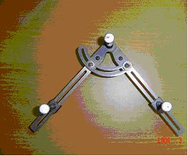 圖 3.1 紅外線動態立體攝影機 3.1.2 肩胛定位器肩胛定位器(圖 3.2)為一類似圓規狀之金屬器且有三個可活動之定位腳,可隨受測者肩胛骨大小,尺寸不同,進行調整,目的將肩胛骨的三角位置定位,防止進行測試時產生的位移誤差。 肩胛定位器校正部分,同一個受試者將三個肩胛骨突肩峰角(Acromial angle)、肩胛脊根部(Root of spine)與肩胛下角(Inferior angle)相對位置確定後,而後實驗將不改變,直至實驗結束,並於每次量測後,利用肩胛固定器,確認相對位置,如圖 3.3 為利用肩胛定位器將肩胛定位圖示意圖。