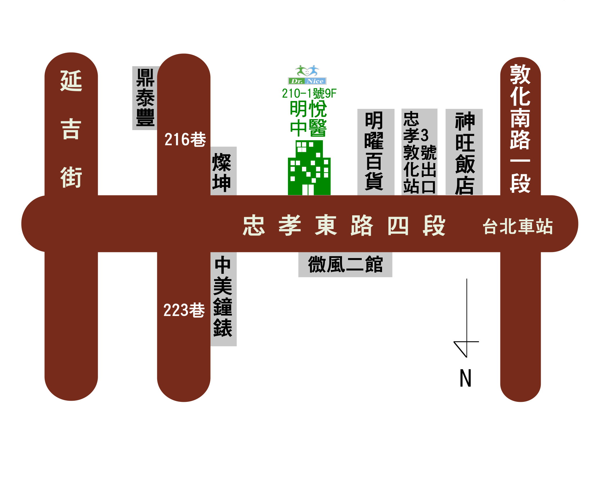 | 板南線-忠孝敦化站3號出口往明曜百貨走第八棟,凌雲大廈9樓。 |